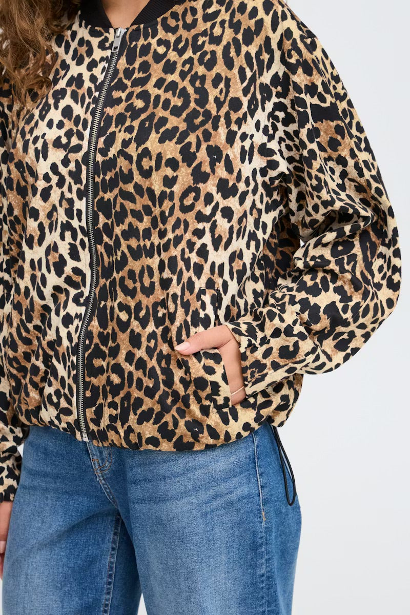Setzen Sie ein klares Statement mit der Ichi IXKATE Bomberjacke im Leopardenmuster – ein echter Hingucker, der Ihrer Garderobe wilde Eleganz verleiht. Die dänisch designte Jacke besticht durch einen auffälligen Tierprint in warmen Camel- und Schwarztönen, der perfekt mit den schicken schwarzen Rippbündchen für einen modernen Look harmoniert.